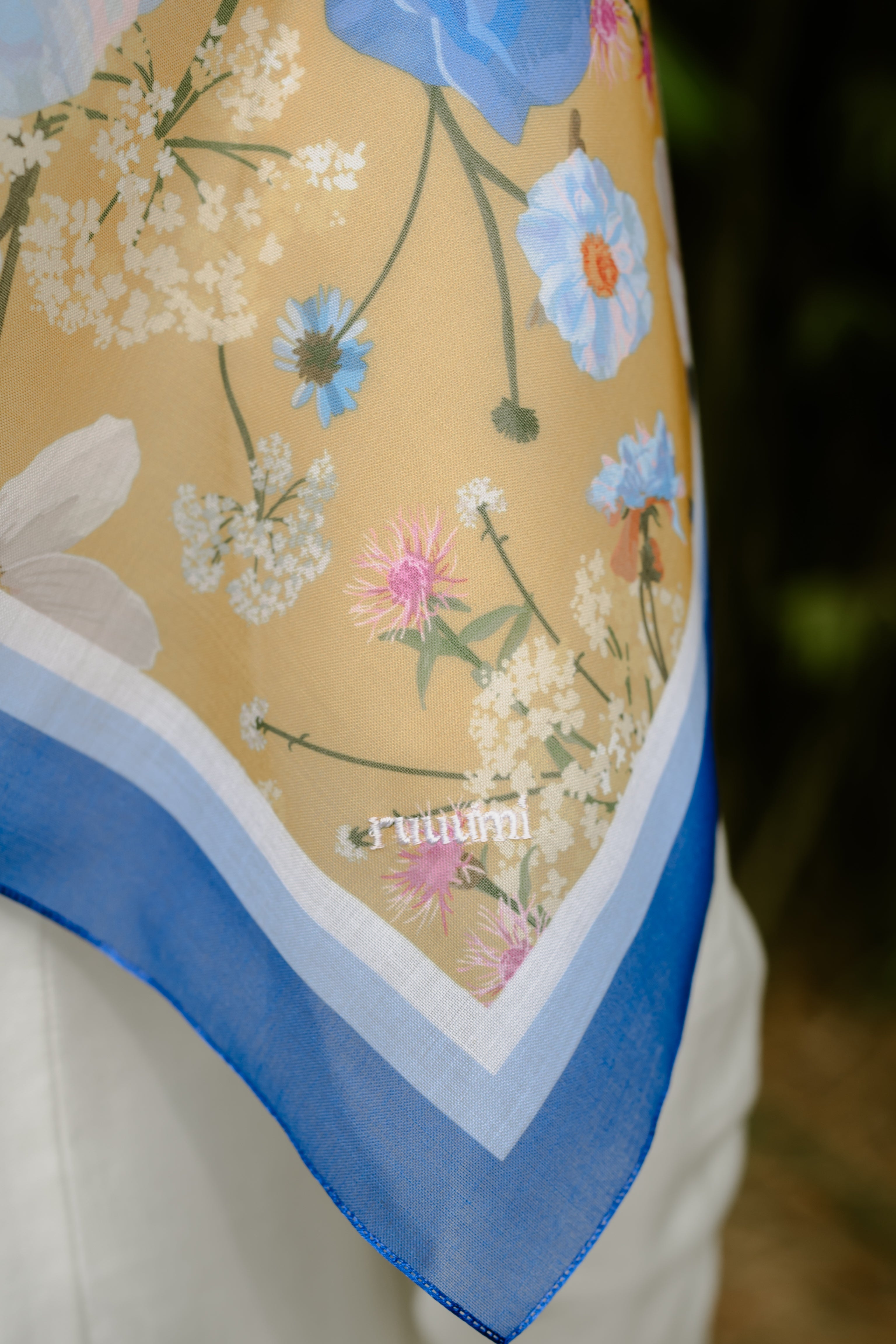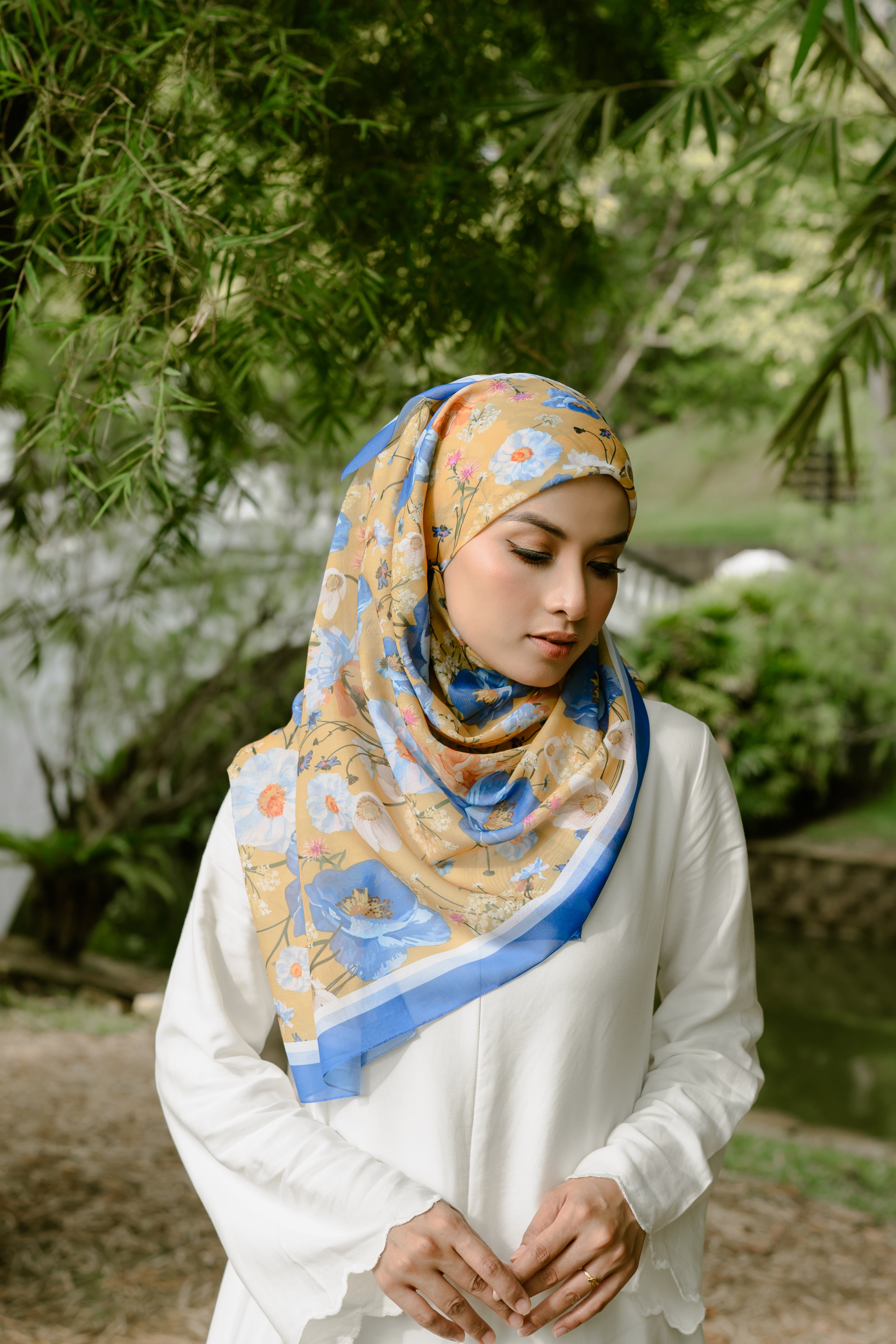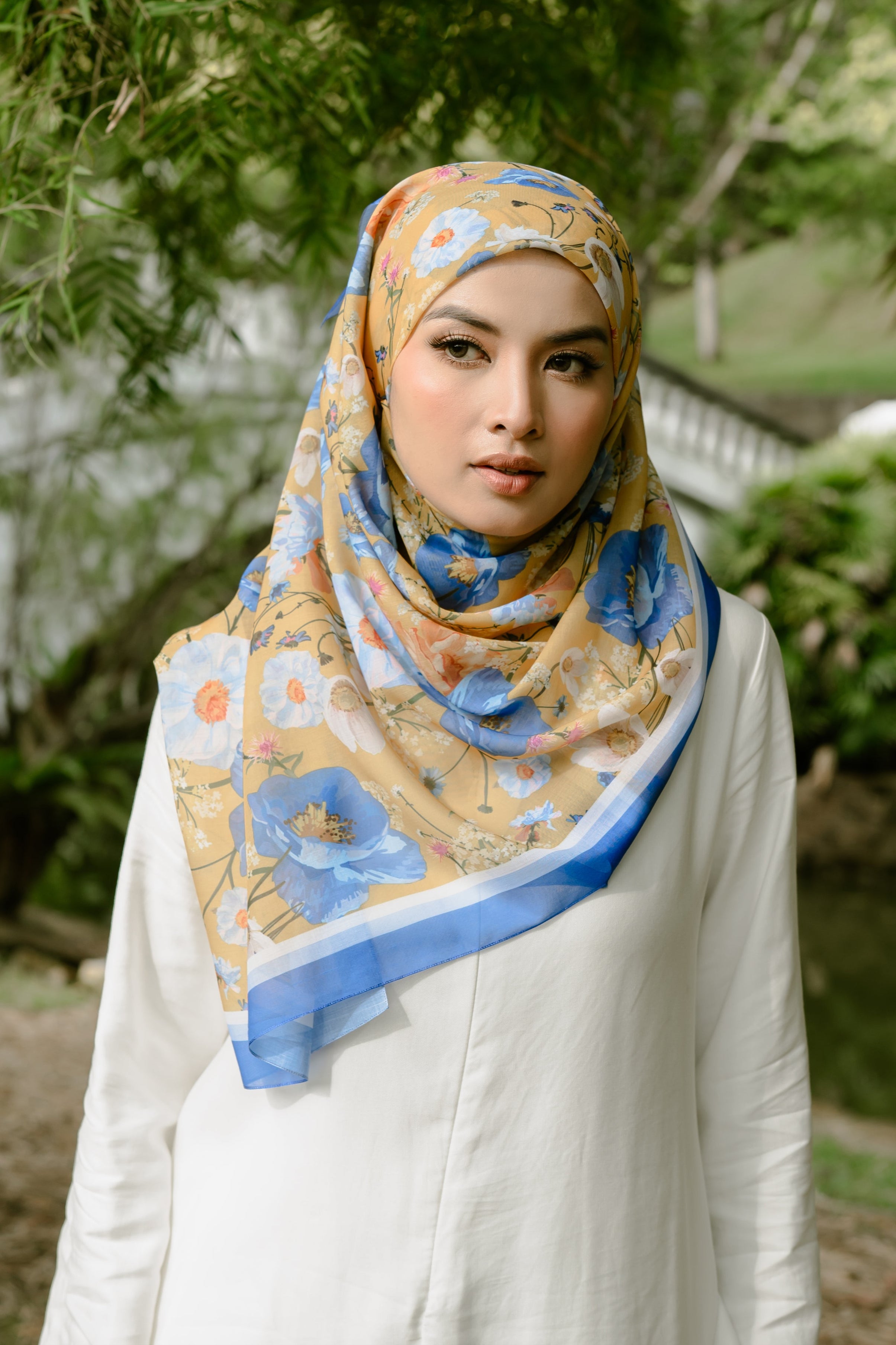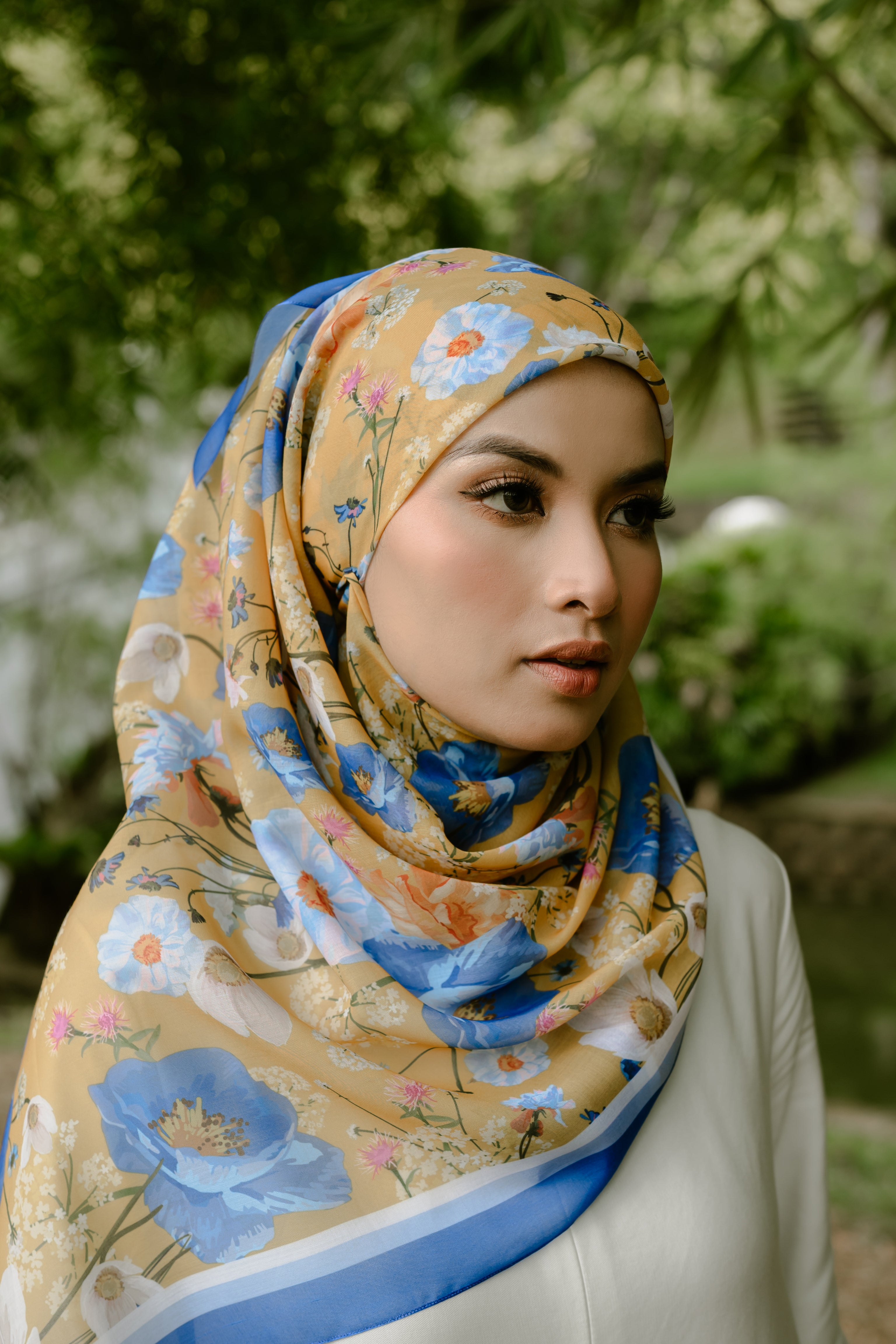 Senja pairs vivid blue flowers with a striking yellow base — capturing contrast, harmony, and individuality. A tudung for when you want to show up fully, in all your colours.Material: Cotton voileSize: 115cm x 115cm